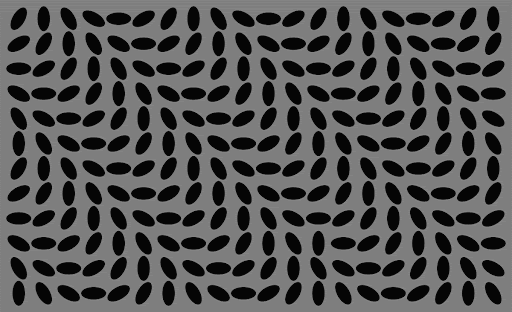 The system seems to struggle when there are harsh changes between several contrast levels, especially on small objects in our peripheral vision. For example, smooth luminance transitions aren’t as problematic as step changes and long edges aren’t as problematic as fragmented or curved edges (Kitaoka, 2003). It likely has something to do with how motion processing in our peripheral vision is updated after a saccade, given that some motion illusions trigger whenever you look somewhere else and stop working if you make the image small enough (see Dr. Kitaoka’s illusions or these illusions by Michael Bach).