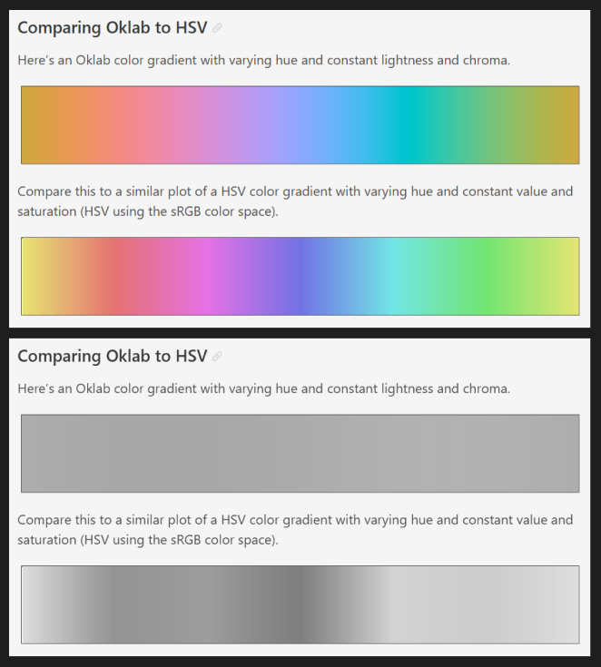 From top to bottom: a color gradient with all brightness differences removed > a more normal gradient > greyscale version of gradient with no brightness differences > greyscale version of normal gradient. Note how we just removed brightness without touching color. Image source: Ottoson, 2020
